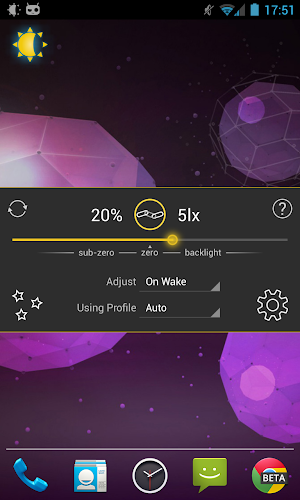 Lux provides the option to automatically adjust the backlight at fixed intervals (periodic mode), when a change in environment is detected (dynamic mode), or when the phone wakes from sleep. It's also possible to adjust the backlight manually. Simply disable automatic mode and you can use it like a traditional brightness tool!